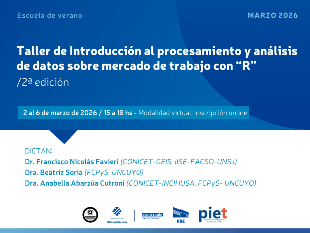 formación Formación: Escuela de R Taller de introducción al procesamiento y... adminFeb 18, 2026Feb 18, 2026 formación Escuela de verano de R En el marco del Programa de... adminFeb 15, 2025 formación Introducción al trabajo con estadísticas de base hemerográfica para el estudio de la conflictividad Fechas: Viernes 18/10, 1/11, 8/11 y... adminOct 5, 2024Oct 9, 2024